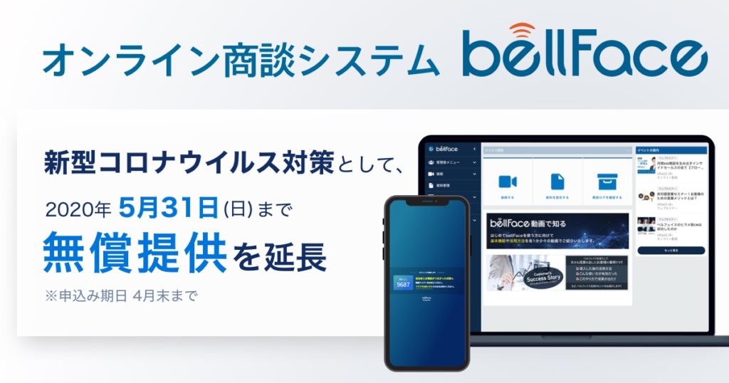 ベルフェイス株式会社(本社:東京都渋谷区、代表取締役:中島 一明)は、新型コロナウイルスの感染拡大に伴い、現在無償提供しているオンライン商談システム「bellFace」の提供期間を2020年5月31日(日)まで延長することを決定いたしました。