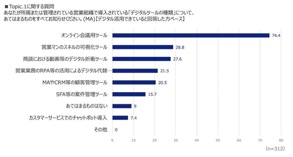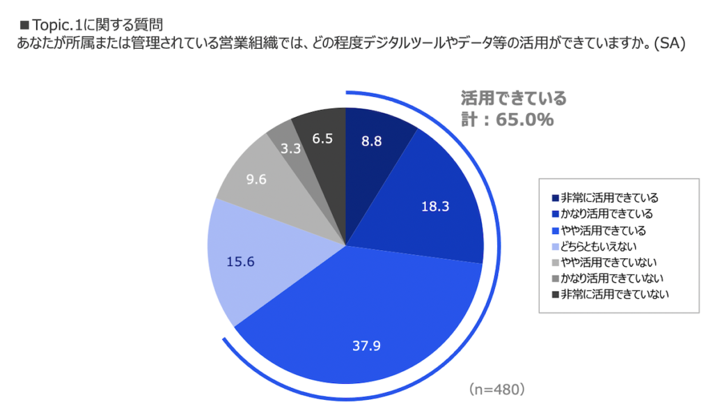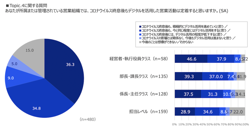総括として、オンライン商談ツールを導入することによりコロナ過でデジタル活用企業が増加した一方で、デジタル活用の本気度については、企業による温度差があり、営業のデジタル活用については経営層や管理職など、職位が高いほど危機感を強く持っていることが分かった一方で、現場リーダークラスを含めた、全社的なデジタルリテラシーと理解を向上させすることが、職場内のデジタル活用に関する温度差を無くしていくことに繋がると考えられます。