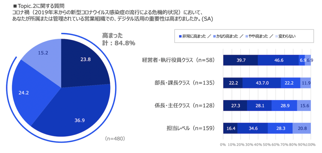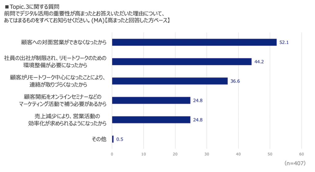 デジタル活用の重要性が高まった理由は「顧客への対面営業ができなくなった から(52%)」が最多。実際にコロナ以前(2019年)と比較して、緊急