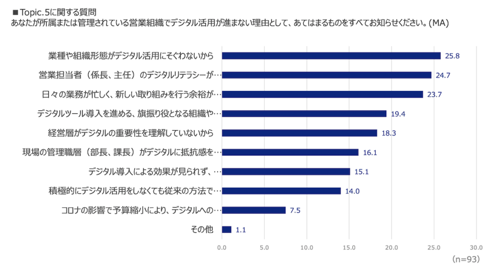 現在デジタル活用が進んでいない理由は「業種や組織形態がデジタル活用に そぐわないから(26%)」が最も高く、「営業担当者(係長、主任)のデジタルリテラシーが不足しているから(25%)」「日々の業務が忙しく、新しい 取り組みを行う余裕がないから(24%)」と続く。デジタル活用が進まない 理由を経営層や管理職に求めるよりも、現在の現場業務の延長線で難しいと捉える傾向が強い。