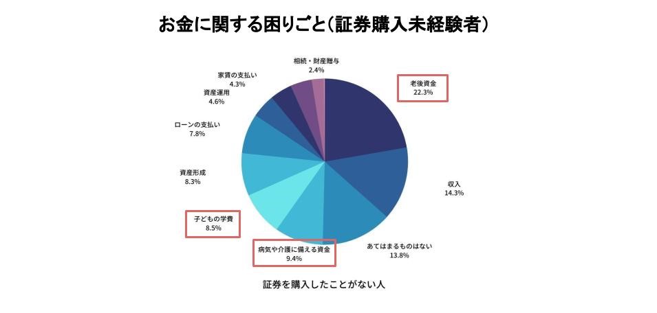 ・お金にまつわる困りごとは証券購入経験者/未経験者共に「老後資金」が1位に。証券を購入したことがない人にも資産形成に対する潜在的なニーズが伺える。