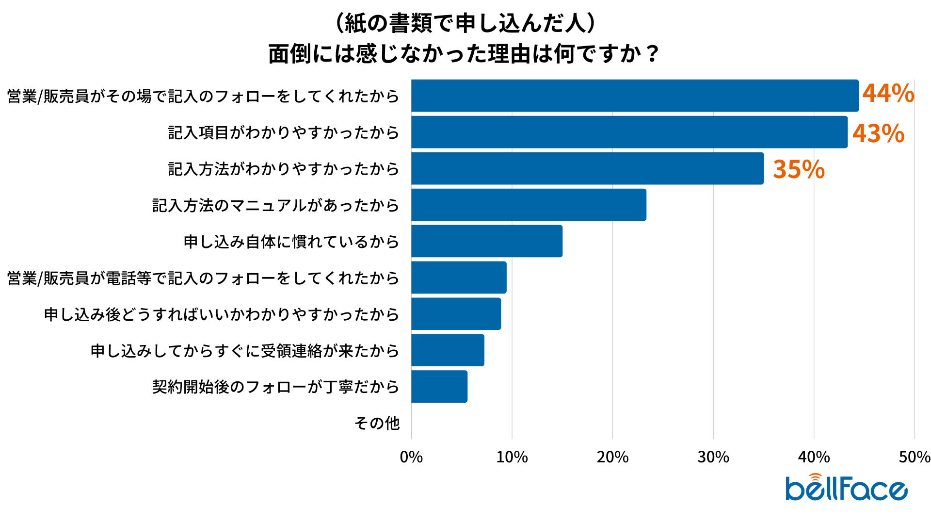 一方、「面倒には感じなかった理由は何ですか?」という質問に対して、“紙の書類で申し込んだ人”は「営業/販売員がその場で記入のフォローをしてくれたから」という回答が約44%と最も多い結果になりました。
