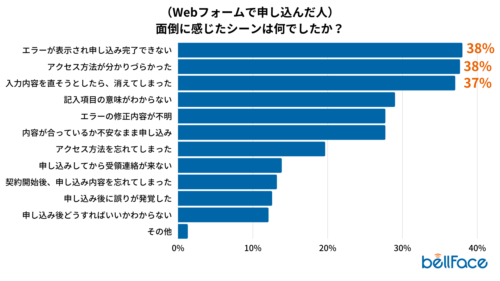 “Webフォームで申し込んだ人”は「エラーが表示され申し込み完了できない」が約38%、「アクセス方法が分かりづらかった」が約38%、「入力内容を直そうとしたら、消えてしまった」が約37%と、Webフォームの操作方法に関する困りごとが多い結果になりました。