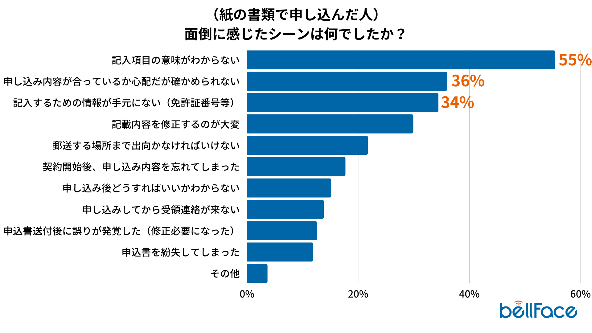 「面倒に感じたシーンは何でしたか」という質問に対し、“紙の書類で申し込んだ人”は「記入項目の意味がわからない」が約55%、「申し込み内容が合っているか心配だが確かめられない」が約36%、「記入するための情報が手元にない(免許証番号等)」が約34%と、申込書類の記入時における困りごとが多い結果になりました。