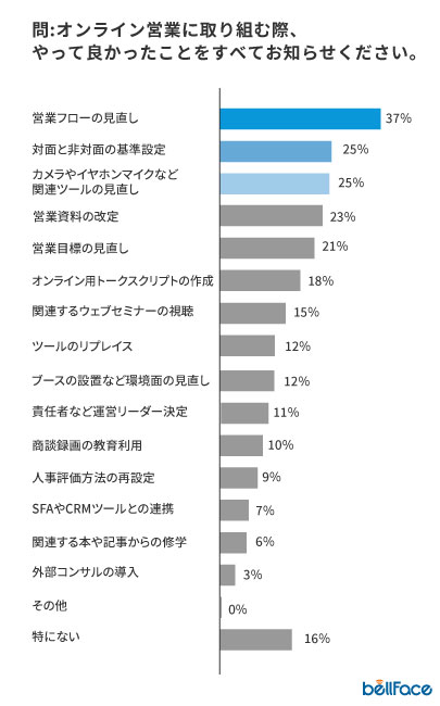 下記の「オンライン営業に取り組む際やって良かったこと」への回答でも分かる通り、営業フローを見直してよかったと答えている方だけでも約4割に上り、オンライン営業を取り入れることは営業組織そのものの改革にも繋がっていることがわかります。