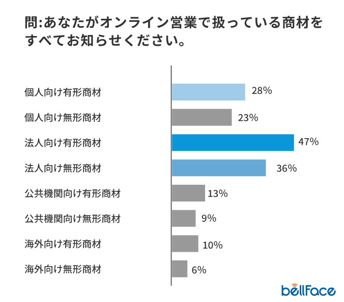 オンライン商材で扱われている商材は法人向けが特に多く、有形商材が47%、無形商材が36%と、個人向け商材に30ポイント以上の差をつけました。