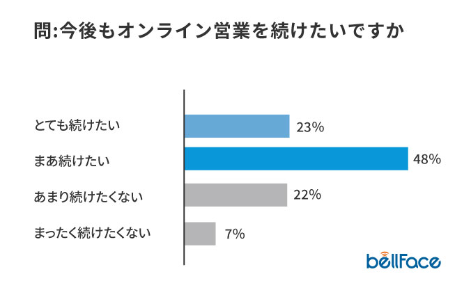 苦手意識や合わない場面はあるものの、今後もオンライン営業を「続けたい」と答えた方の割合は7割に上りました。
