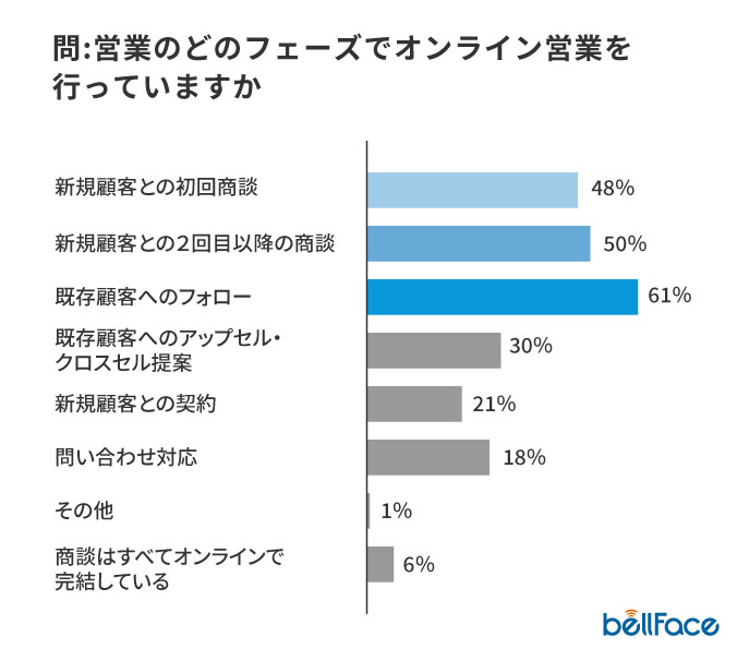 • ・オンライン営業がよく使われるフェーズは「新規顧客との商談」と「既存顧客へのフォロー」