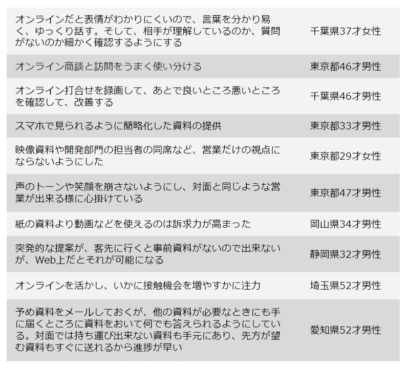 • ・「遠方やなかなか時間が取れない中小顧客に対してはオンライン商談という手段が増えたことで明らかに商談機会が増えた」(東京都29才女性)