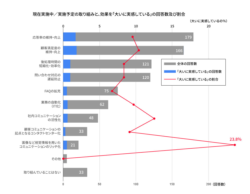 「画像など視覚情報を用いたコミュニケーションのリッチ化」は、効果を「大いに実感している」23.8%。取り組んでいる企業の数こそ少ないですが、成果を実感している企業は他の取り組みに比べて2倍以上の成果を出しています。