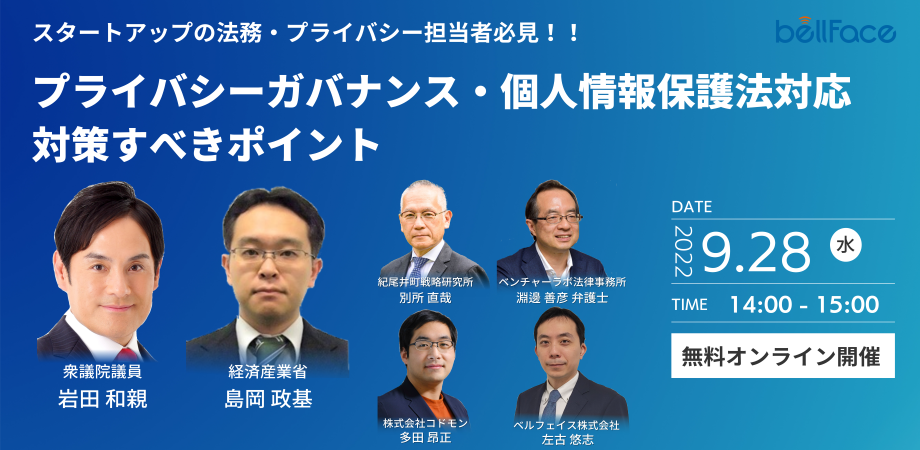 オンライン営業システム「bellFace(ベルフェイス)」の開発・販売事業を行う、ベルフェイス株式会社(本社:東京都港区、代表取締役:中島 一明、以下「ベルフェイス」)は、9月28日(水)にスタートアップの法務、プライバシー担当者に向けたプライバシーガバナンス・個人情報保護法に関する無料セミナーを開催することをお知らせします。