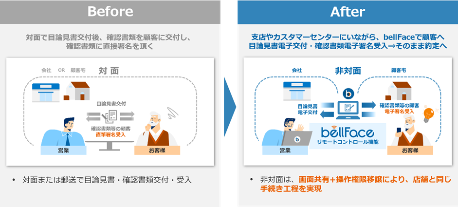 「bellFace」のリモートコントロール機能を活用することで、商品のご契約に必要な書類をスムーズに電子徴求することが可能になり、お客さまの利便性を高めるとともに営業効率をあげることが可能となります。