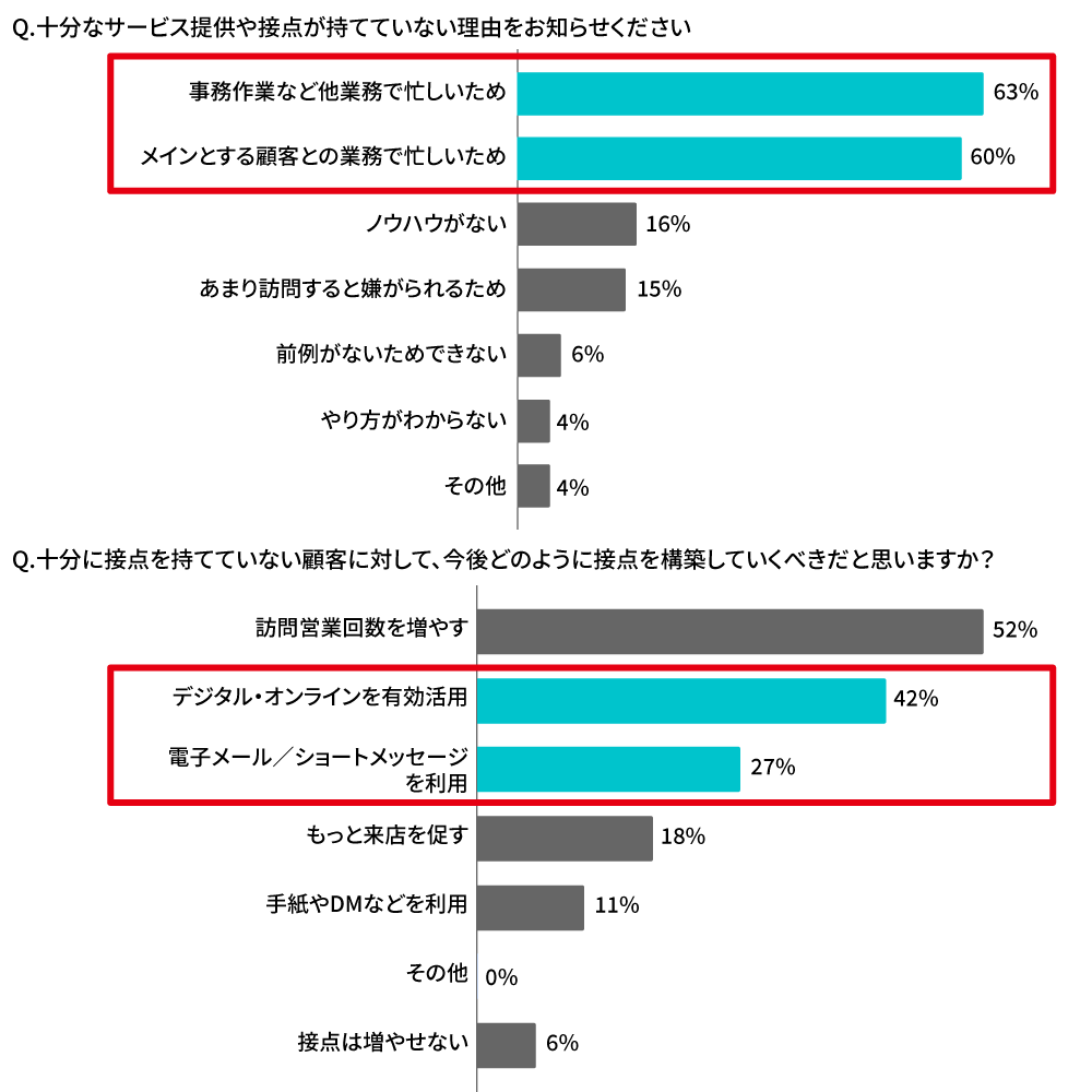 十分なサービス提供や接点が持てていない理由を改めて深掘りすると、やはり「メインとする顧客との業務で忙しい」「事務作業など他の業務で忙しい」が圧倒的2トップで、これを解消することが鍵になると考えられます。