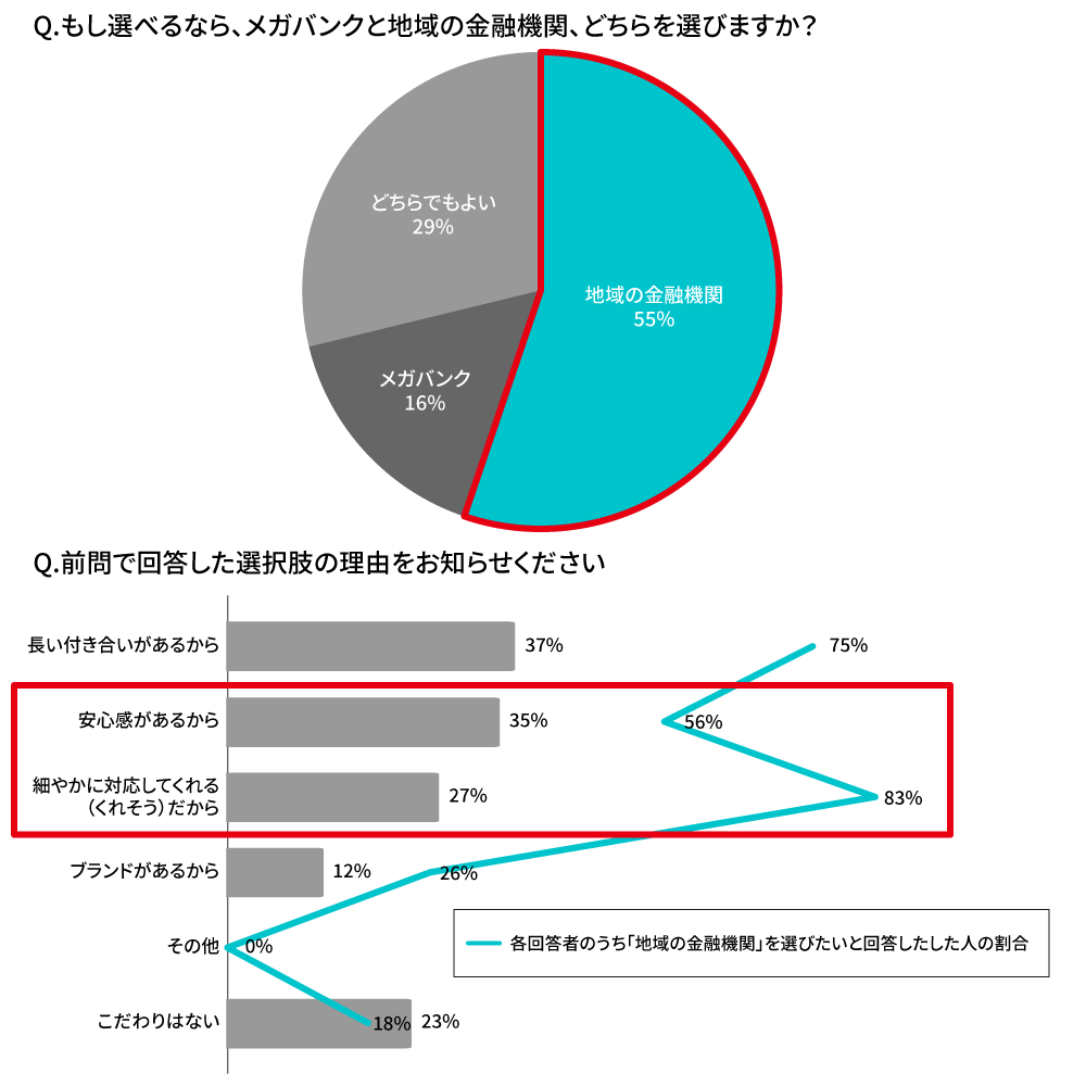 決して銀行が毛嫌いされているわけではない、ということをきちんと伝えておきたいと思います。「もし選べるなら、メガバンクと地域の金融機関(地銀や信金など)、どちらを選びますか?」という質問に対して、距離の近さをお家芸のようにしてきた「地域の金融機関」が選ばれるということは、距離の近さを必要としているからです。