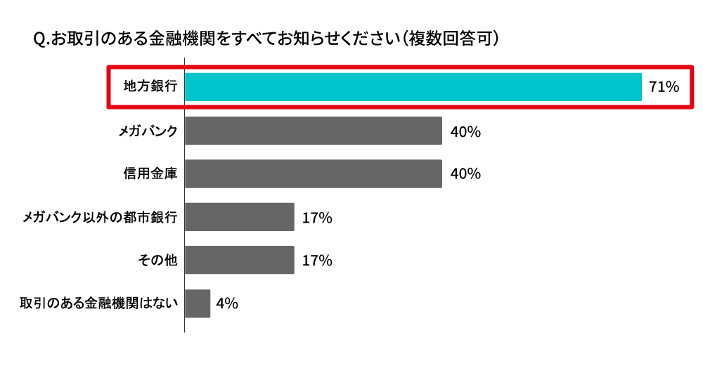 三大都市を除く地方の経営者・役員の方へ向けた調査では、まず「お取引のある金融機関」をお尋ねしました。結果は地方銀行が71%と圧倒的な1位で、地方企業にとって地方銀行は大きな存在感を持っていることがわかりました。では、その銀行(金融機関)の法人営業とは、やはり密な付き合いがあるのかというと、密な付き合いが「ある」と回答したのは48%で、そうとは言い切れないというのが実情のようです。また、金融機関別に見ても、いずれも「ある」は50%前後で、いわゆる「密な付き合い」は地銀だけの専売特許ではないことがわかります。