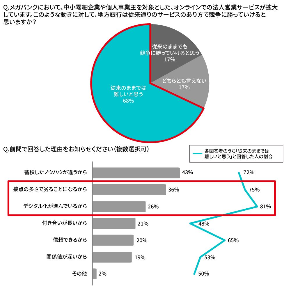 一方、メガバンクにおいて顧客との「接点」を中心とした法人営業の取り組みが始まっていることをご存知でしょうか。法人営業の方には、最後に率直な質問を投げかけています。メガバンクが中小企業を対象としたオンラインでの営業を活発化してきているなかで、地方銀行と競争になった時、従来のままの銀行の姿で競争に勝てると思うか?というものです。「従来のままでは難しいと思う」と思うと回答した方は68%に上りました。現場の肌感として、すでに「距離の近さ」では接点構築において訪問だけではデジタルに勝てないと感じているようです。また理由において「接点の多さで劣ることになるから」の回答は36%に上り、いかに現場が接点の多さを本来大切にしたいと考えているかがわかると同時に、数少ない訪問ではオンラインによる接点数の多さには勝てないと考えていることがわかります。